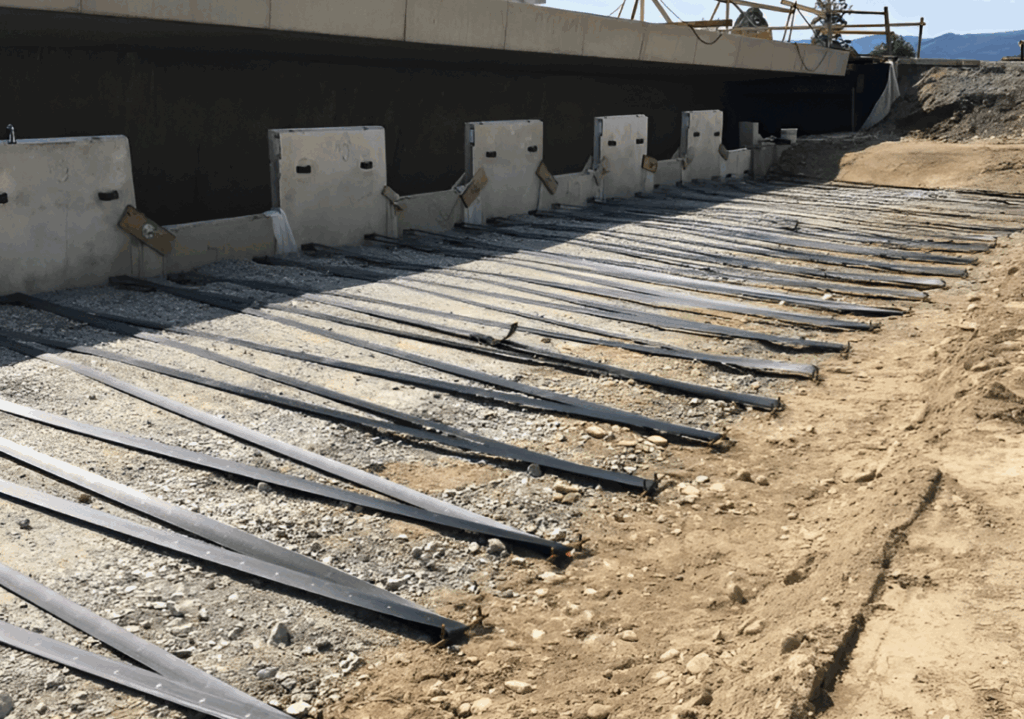 “ParaDrain is manufactured from high-tenacity, multifilament polyester yarns aligned and coextruded with LLDPE to form polymeric strips,” Bradley says. “The longitudinal strips have a channel shape and are covered by a geotextile to provide draining capacity in this direction. The strips are laid flat in the machine direction with a secondary strip laid and welded across the full width in the cross direction.”